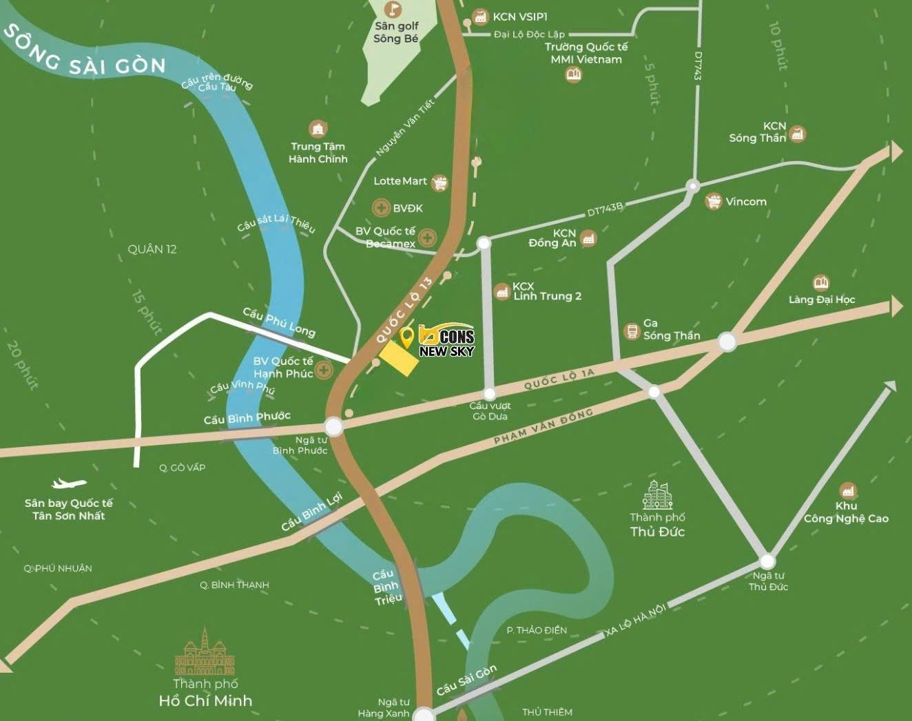 Bcons NewSky tọa lạc trên mặt tiền Quốc lộ 13 – vị trí chiến lược của phường Lái Thiêu, TP. Hồ Chí Minh. (TP. Thuận An, Bình Dương – Cũ).